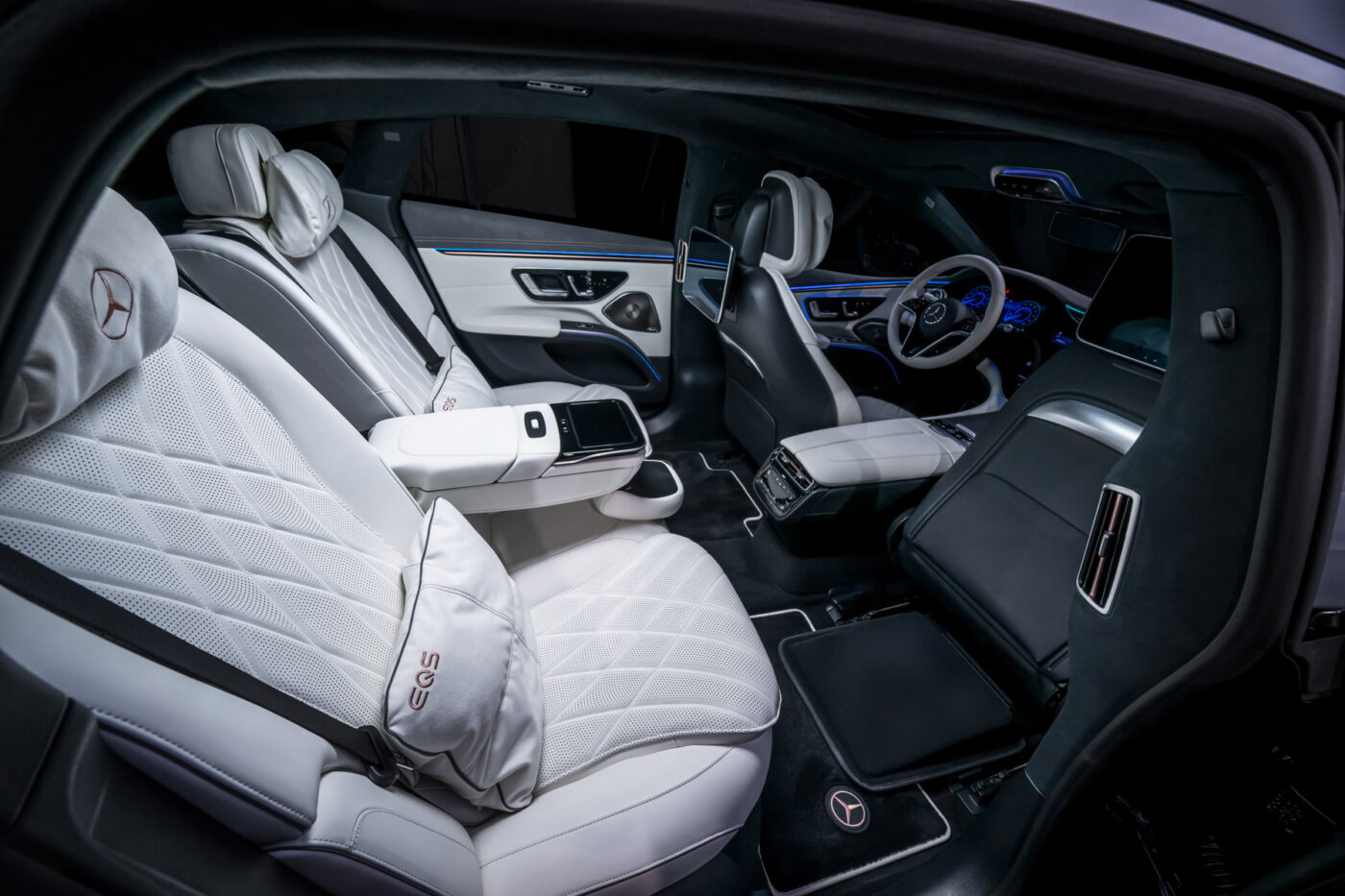 其他精美的细节也体现在EQS轿车的内饰上。 B 柱上的空调通风口现在选用镀铬装修。比照色缝线和 Nappa 皮革滚边增强了后排乘客的舒适枕头。